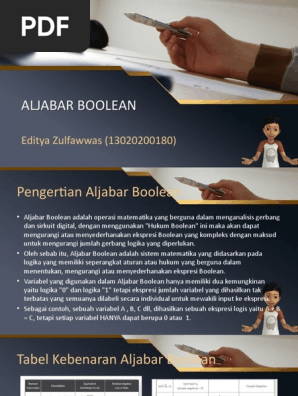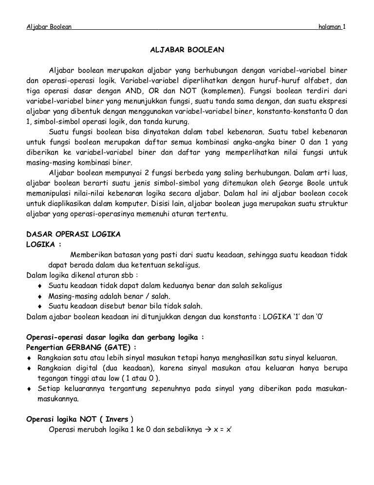 Aljabar atau algebra adalah cabang ilmu matematika yang mempelajari tentang hubungan, pola, struktur, dan kuantitas. Ungkapan boolean komputer digital modern dirancang. Aljabar boolean logical boolean penamaan aljabar boolean sendiri berasal dari nama seorang matemati. Aljabar boolean dapat didefinisikan secara abstrak dalam beberapa cara. Definisi access point (ap) berikut adalah. Aljabar boolean, hukum aljabar boolean, dan manipulasi boolean, dan contoh soal. Pengertian aljabar boolean dan hukumnya teknik elektronika. Aljabar boolean adalah aljabar yang berhubungan dengan variabel biner dan operasi logik, dimana aljabar boolean adalah sistem matematika yang terbentuk dari 3 operator logika berupa negasi. Teorema aljabar boolean aljabar boolean sangat penting peranannya di dalam proses perancangan maupun analisis rangkaian logika. Pengertian aljabar boolean contoh soal dan pembahasan. Aljabar boolean kita mulai dari aljabar boolean? Aljabar boolean untuk mempunyai sebuah aljabar boolean, harus diperlihatkan: Cara yang paling umum adalah dengan menspesifikasikan unsur unsur.